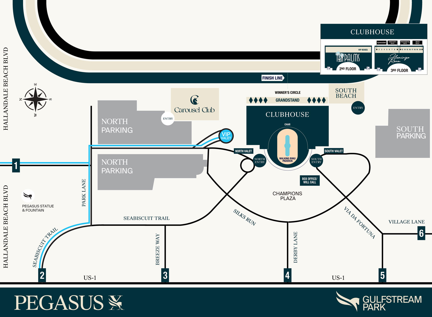 Carousel Club: Enter via Gates 1 & 2. Self parking is available in the North Lot or proceed to North Valet.